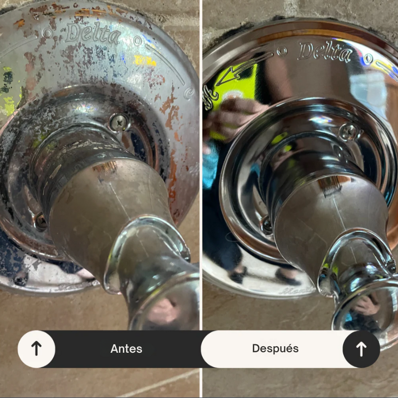 Elimina totalmente la opacidad blanca y las manchas de agua dura, dejando el cromo y el vidrio relucientes como el primer día
